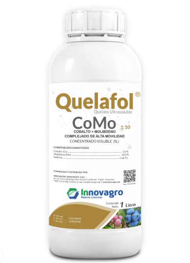 QUELAFOL CoMo, es un fertilizante foliar a base de Cobalto (Co) y Molibdeno (Mo), elementos claves para prevenir y corregir la deficiencias de estos elementos en los momentos de máxima actividad vegetativa (desde brotamiento a fructificación) recuperando y estimulando el buen crecimiento y desarrollo de la planta.